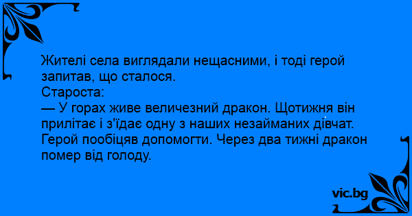 Герой пообіцяв допомогти. Через два тижні дракон помер від голоду.