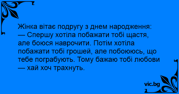 — Спершу хотіла побажати тобі щастя, але боюся наврочити. Потім хотіла побажати тобі грошей, але побоююсь, що тебе пограбують. Тому бажаю тобі любови — хай хоч трахнуть.