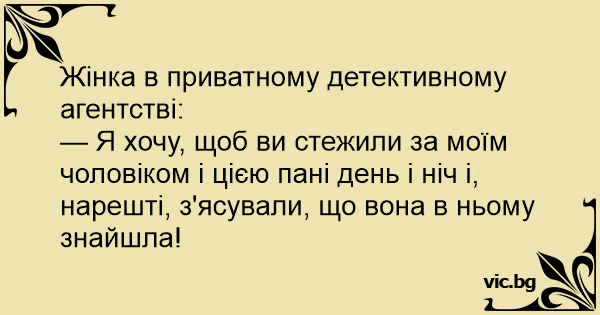 — Я хочу, щоб ви стежили за моїм чоловіком і цією пані день і ніч і, нарешті, з'ясували, що вона в ньому знайшла!