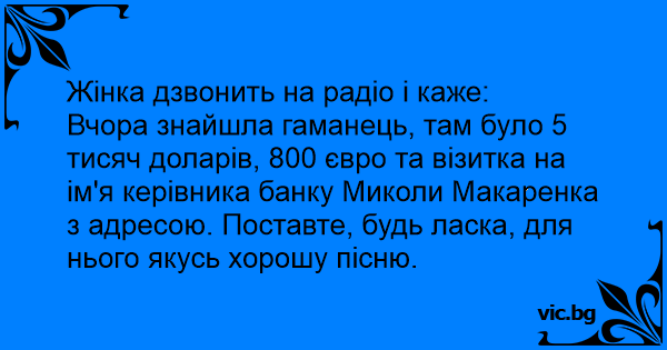 Вчора знайшла гаманець, там було 5 тисяч доларів, 800 євро та візитка на ім'я керівника банку Миколи Макаренка з адресою. Поставте, будь ласка, для нього якусь хорошу пісню.