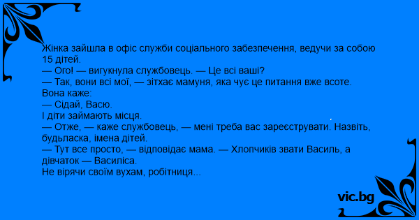 — Отже, — каже службовець, — мені треба вас зареєструвати. Назвіть, будьласка, імена дітей.