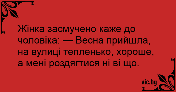 Жінка засмучено каже до чоловіка: — Весна прийшла, на вулиці тепленько, хороше, а мені роздягтися ні ві що.