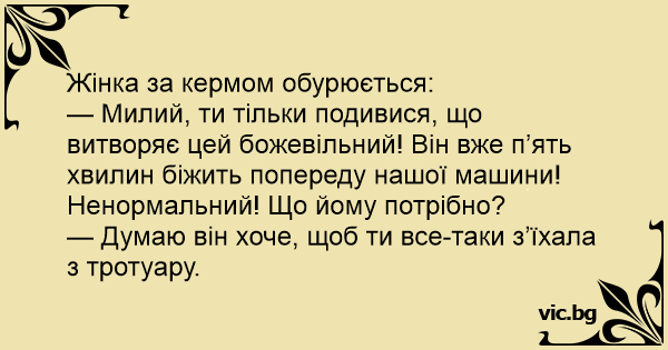 — Милий, ти тільки подивися, що витворяє цей божевільний! Він вже п’ять хвилин біжить попереду нашої машини! Ненормальний! Що йому потрібно?