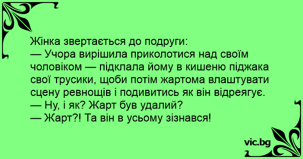 — Учора вирішила приколотися над своїм чоловіком — підклала йому в кишеню піджака свої трусики, щоби потім жартома влаштувати сцену ревнощів і подивитись як він відреягує.