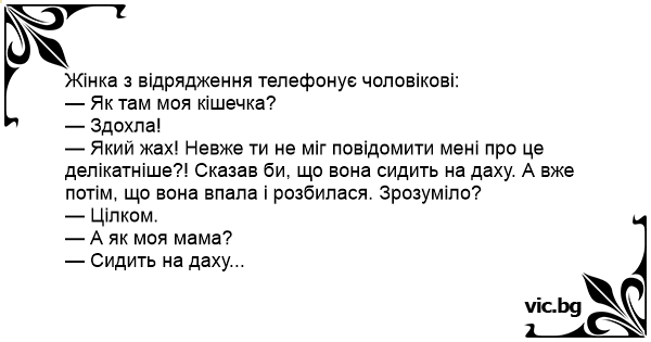 — Який жах! Невже ти не міг повідомити мені про це делікатніше?! Сказав би, що вона сидить на даху. А вже потім, що вона впала і розбилася. Зрозуміло?