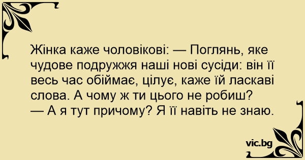 Los vecinos siguen enamorados Жена към съпруга си: Жена ми ме упреква: За завтраком жена сердито пеняет своему мужу: Съпруга следи новите си съседи: Жена казва на мъжа си: Die Ehefrau zu ihrem Ehemann" - Oi, amor... À noite, enquanto o marido lia o jornal, a esposa comentou: Julia tells her husband, "James, that young couple that just moved in next door seem such a loving twosome. Every morning, when he leaves the house, he kisses her goodbye, and every evening when he comes homes, he brings her a dozen roses. Now, why can't you do that?" "Gosh," James says, "why I... Fru Olsson till sin äkta hälft: - Herr Bergqvist här intill brukar ge sin fru en kyss på kinden varje dag innan han går till jobbet. Varför kan inte du göra detsamma? - är du inte klok? Jag... Frun menande till mannen när hon ger honom portföljen i dörren: - Herr Göransson ger alltid sin fru en kyss innan han går till jobbet på morgonen. Varför gör inte du det? - är du inte klok? Jag... A farmer and his wife had just waken up one morning to the crowing of their rooster. While still in bed, the farmer's wife says, "Pa, you know our neighbor Mr. Jones?" "Yes Ma, I reckon I do,"... Een vrouw klaagt gepikeerd tegen haar man: "Elke ochtend als de buurman naar zijn werk vertrekt kust hij hartstochtelijk zijn vrouw. Waarom doe jij dat nooit?" Waarop de man antwoord: "Waarom!?… Ik... La esposa, echando de menos el cariño del noviazgo, le dice al esposo: Pepe, te has fijado que el vecino besa todos los días a su mujer cuando se va a al trabajo ¿ Por qué no haces tú lo mismo? ¿De... Wife: "Our new neighbor always kisses his wife when he leaves for work. Why don't you do that?" Husband: "How can I? I don't even know her." Egy asszony panaszosan mondja a férjének: - Észrevetted már, hogy amikor a szomszédunk hazaér a munkából, mindig átöleli és csókkal üdvözli a feleségét? Te miért nem csinálod ezt? - Nem ismerem még... Una señora le dice al esposo: Los nuevos vecinos son tan amorosos, él la besa, la acaricia, le hace arrumacos, ¿Por qué tú no haces lo mismo? Le responde el esposo: ¡ Pues, porque yo casi no... Una pareja subiendo a un auto: - Mi amor, ¿viste lo tierno y cariñoso que es el nuevo vecino con su esposa?¿Viste como la besa y acaricia? Y sigue: - ¿Por qué tú no haces lo mismo? - ¡Ay mija,...