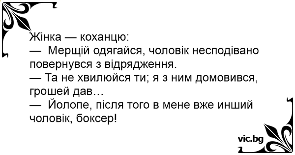 — Йолопе, після того в мене вже инший чоловік, боксер!
