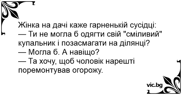 — Ти не могла б одягти свій "сміливий" купальник і позасмагати на ділянці?