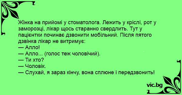 Жінка на прийомі у стоматолога. Лежить у кріслі, рот у заморозці, лікар щось старанно свердлить. Тут у пацієнтки починає дзвонити мобільний. Після пятого дзвінка лікар не витримує: