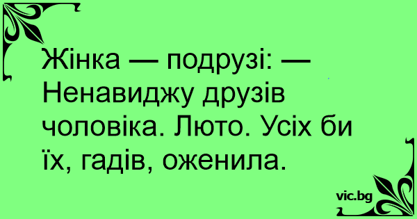 Жінка — подрузі: — Ненавиджу друзів чоловіка. Люто. Усіх би їх, гадів, оженила.