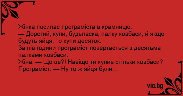 — Дорогий, купи, будьласка, палку ковбаси, й якщо будуть яйця, то купи десяток.