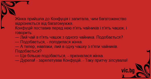 Жінка прийшла до Конфуція і запитала, чим багатоженство відрізняється від багатомужжя.