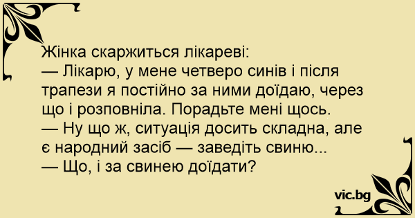 — Лікарю, у мене четверо синів і після трапези я постійно за ними доїдаю, через що і розповніла. Порадьте мені щось.
