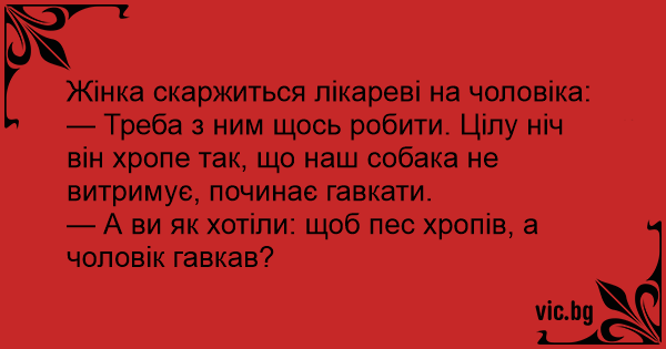 — Треба з ним щось робити. Цілу ніч він хропе так, що наш собака не витримує, починає гавкати.