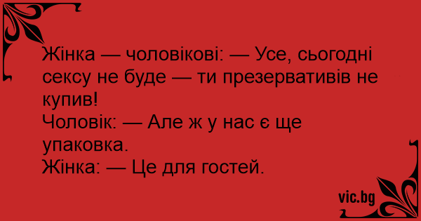 Жінка — чоловікові: — Усе, сьогодні сексу не буде — ти презервативів не купив!