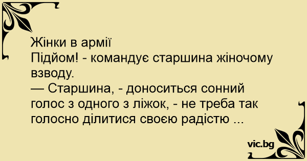 — Старшина, - доноситься сонний голос з одного з ліжок, - не треба так голосно ділитися своєю радістю ...