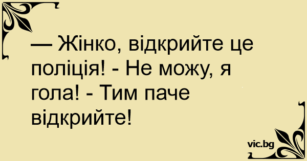 — Жінко, відкрийте це поліція! - Не можу, я гола! - Тим паче відкрийте!
