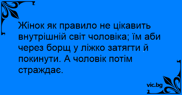 Жінок як правило не цікавить внутрішній світ чоловіка; їм аби через борщ у ліжко затягти й покинути. А чоловік потім страждає.