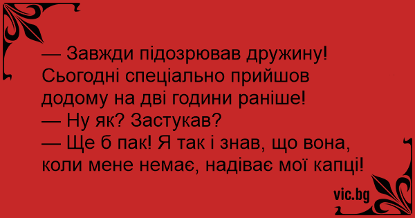 — Ще б пак! Я так і знав, що вона, коли мене немає, надіває мої капці!