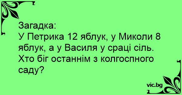 У Петрика 12 яблук, у Миколи 8 яблук, а у Василя у сраці сіль.