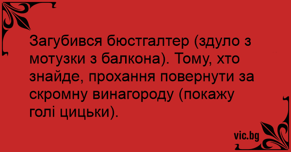 Загубився бюстгалтер (здуло з мотузки з балкона). Тому, хто знайде, прохання повернути за скромну винагороду (покажу голі цицьки).