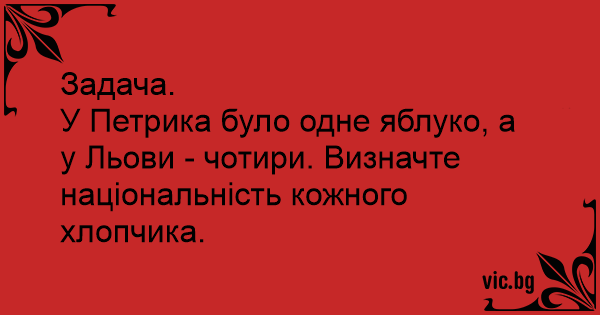 У Петрика було одне яблуко, а у Льови - чотири. Визначте національність кожного хлопчика.