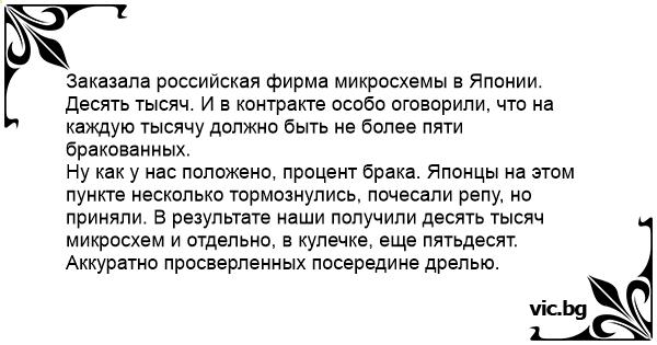 Заказала российская фирма микросхемы в Японии. Десять тысяч. И в контракте особо оговорили, что на каждую тысячу должно быть не более пяти бракованных.