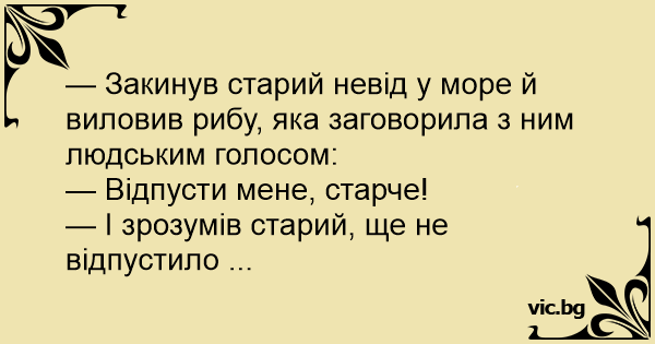 — Закинув старий невід у море й виловив рибу, яка заговорила з ним людським голосом: — Відпусти мене, старче! — І зрозумів старий, ще не відпустило ...