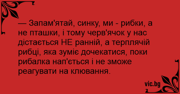 — Запам'ятай, синку, ми - рибки, а не пташки, і тому черв'ячок у нас дістається НЕ ранній, а терплячій рибці, яка зуміє дочекатися, поки рибалка нап'ється і не зможе реагувати на клювання.