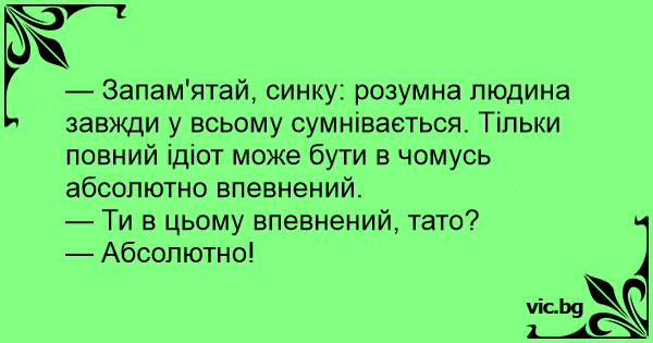 - Запомни, сынок, умный человек всегда во всем сомневается. Только дурак может быть полностью уверенным в чем-то... - Ты уверен в этом, папа? - Абсолютно!