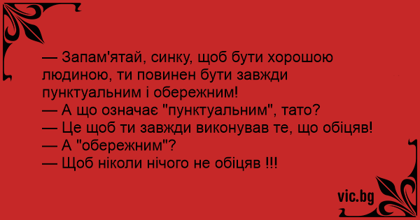 — Запам'ятай, синку, щоб бути хорошою людиною, ти повинен бути завжди пунктуальним і обережним!