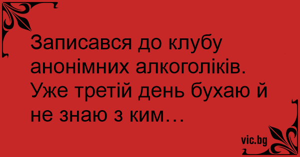 Записався до клубу анонімних алкоголіків. Уже третій день бухаю й не знаю з ким…