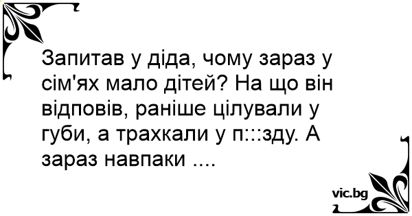 Запитав у діда, чому зараз у сім'ях мало дітей? На що він відповів, раніше цілували у губи, а трахкали у п:::зду. А зараз навпаки ....