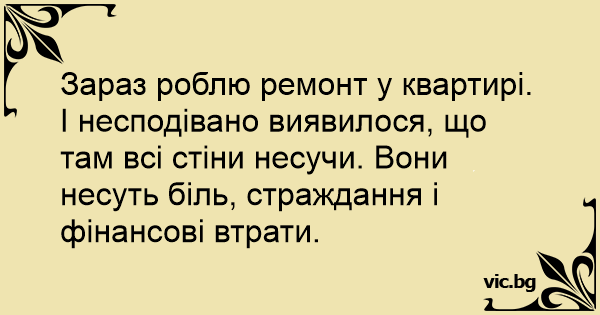 Зараз роблю ремонт у квартирі. І несподівано виявилося, що там всі стіни несучи. Вони несуть біль, страждання і фінансові втрати.
