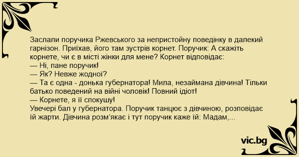 Заслали поручика Ржевського за непристойну поведінку в далекий гарнізон. Приїхав, його там зустрів корнет. Поручик: А скажіть корнете, чи є в місті жінки для мене? Корнет відповідає: