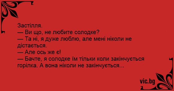— Бачте, я солодке їм тільки коли закінчується горілка. А вона ніколи не закінчується...