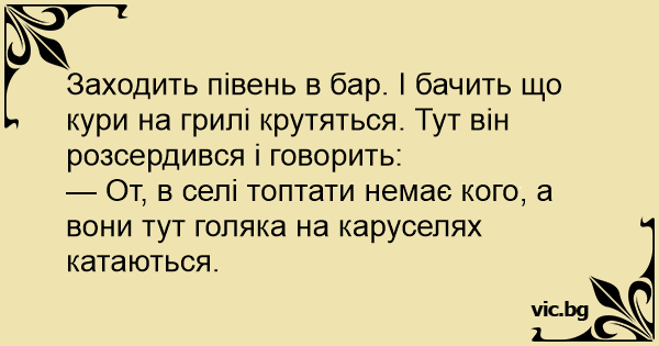 Заходить півень в бар. І бачить що кури на грилі крутяться. Тут він розсердився і говорить: