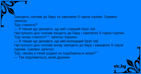 Наступного дня чоловік знову заходить до бару і замовляє 6 чарок горілки. Бармен запитує: