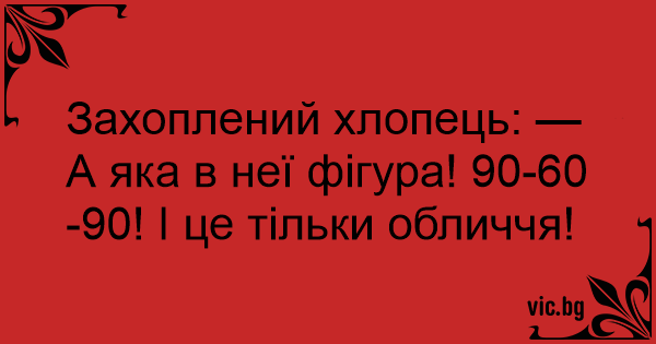 Захоплений хлопець: — А яка в неї фігура! 90-60-90! І це тільки обличчя!