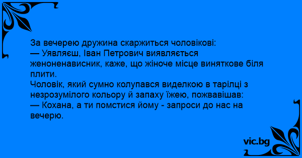 — Уявляєш, Іван Петрович виявляється женоненависник, каже, що жіноче місце виняткове біля плити.