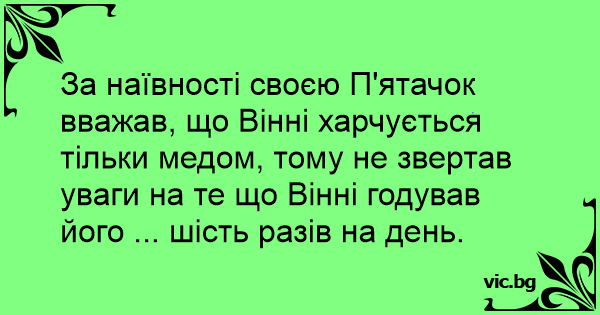 За наївності своєю П'ятачок вважав, що Вінні харчується тільки медом, тому не звертав уваги на те що Вінні годував його ... шість разів на день.