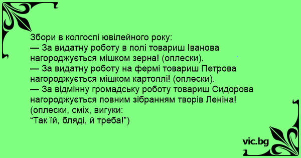 — За видатну роботу на фермі товариш Петрова нагороджується мішком картоплі! (оплески).