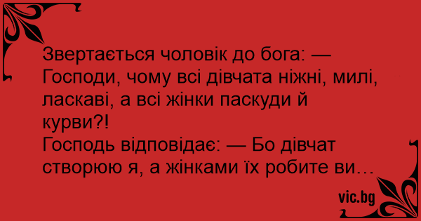 Звертається чоловік до бога: — Господи, чому всі дівчата ніжні, милі, ласкаві, а всі жінки паскуди й kуpbи?!