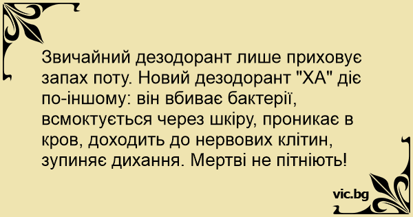 Звичайний дезодорант лише приховує запах поту. Новий дезодорант "ХА" діє по-іншому: він вбиває бактерії, всмоктується через шкіру, проникає в кров, доходить до нервових клітин, зупиняє дихання. Мертві не пітніють!