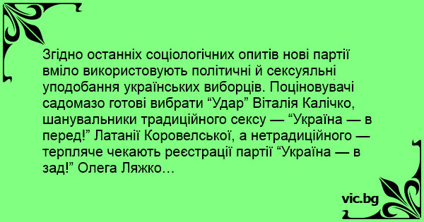 Згідно останніх соціологічних опитів нові партії вміло використовують політичні й сексуяльні уподобання українських виборців. Поціновувачі садомазо готові вибрати “Удар” Віталія Калічко, шанувальники традиційного сексу — “Україна — в перед!” Латанії Коровелської, а нетрадиційного — терпляче чекають реєстрації партії “Україна — в зад!” Олега Ляжко…