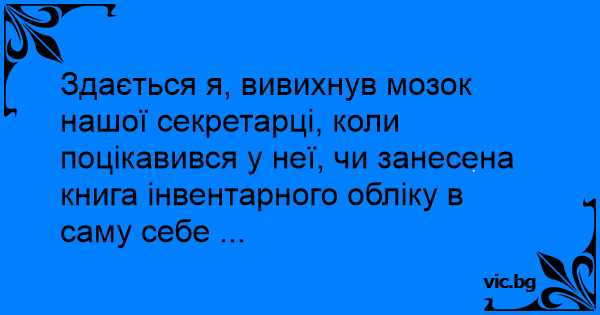 Здається я, вивихнув мозок нашої секретарці, коли поцікавився у неї, чи занесена книга інвентарного обліку в саму себе ...
