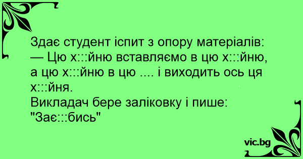 Здає студент іспит з опору матеріалів: — Цю х:::йню вставляємо в цю х:::йню, а цю х:::йню в цю .... і виходить ось ця х:::йня. Викладач бере заліковку і пише: "Зає:::бись"