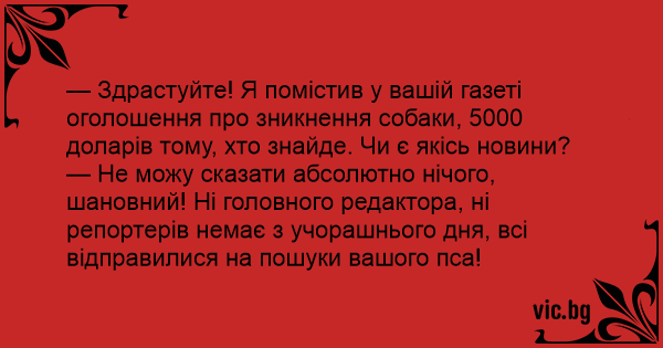— Здрастуйте! Я помістив у вашій газеті оголошення про зникнення собаки, 5000 доларів тому, хто знайде. Чи є якісь новини?