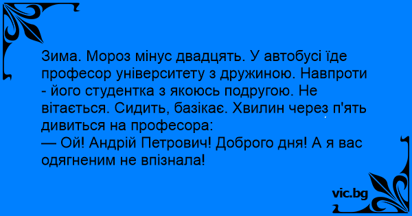 Зима. Мороз мінус двадцять. У автобусі їде професор університету з дружиною. Навпроти - його студентка з якоюсь подругою. Не вітається. Сидить, базікає. Хвилин через п'ять дивиться на професора: