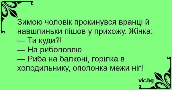 Зимою чоловік прокинувся вранці й навшпиньки пішов у прихожу. Жінка: